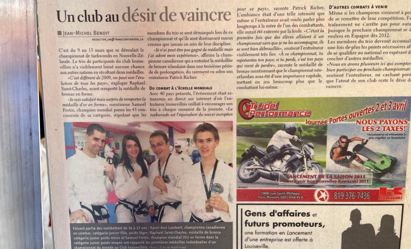 Il s’agit d’une date historique dans l’histoire du club, car le club avait ses  2  premiers représentants lors des championnats mondiaux juniors de Taekwon-do; Simon et Nicolas Bergeron. En plus d’avoir M. Patrick Richer comme membre de l’équipe de coach sur l’équipe canadienne.