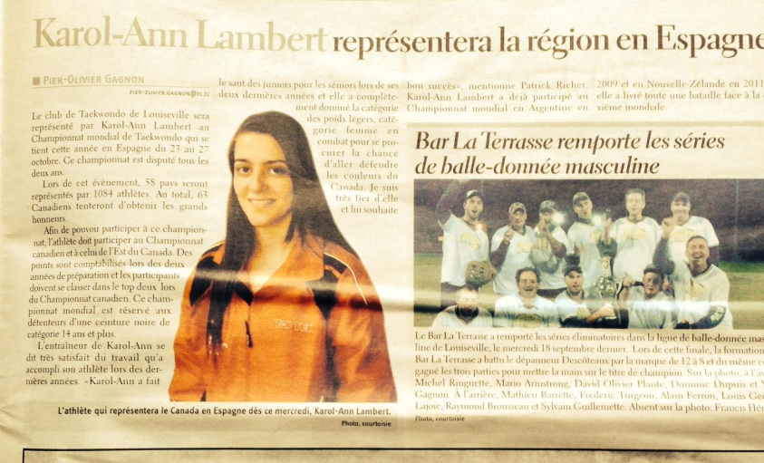 Lors des championnats mondiaux tenus en Espagne, le club était représenté par Karol-Ann Lambert. Elle a fort bien fait en s’inclinant devant une des légendes du Taekwon-do ITF Katya Solovey, qui a gagné le Championnat du monde pour une 4ème fois et qui est plusieurs fois championne d’Europe.